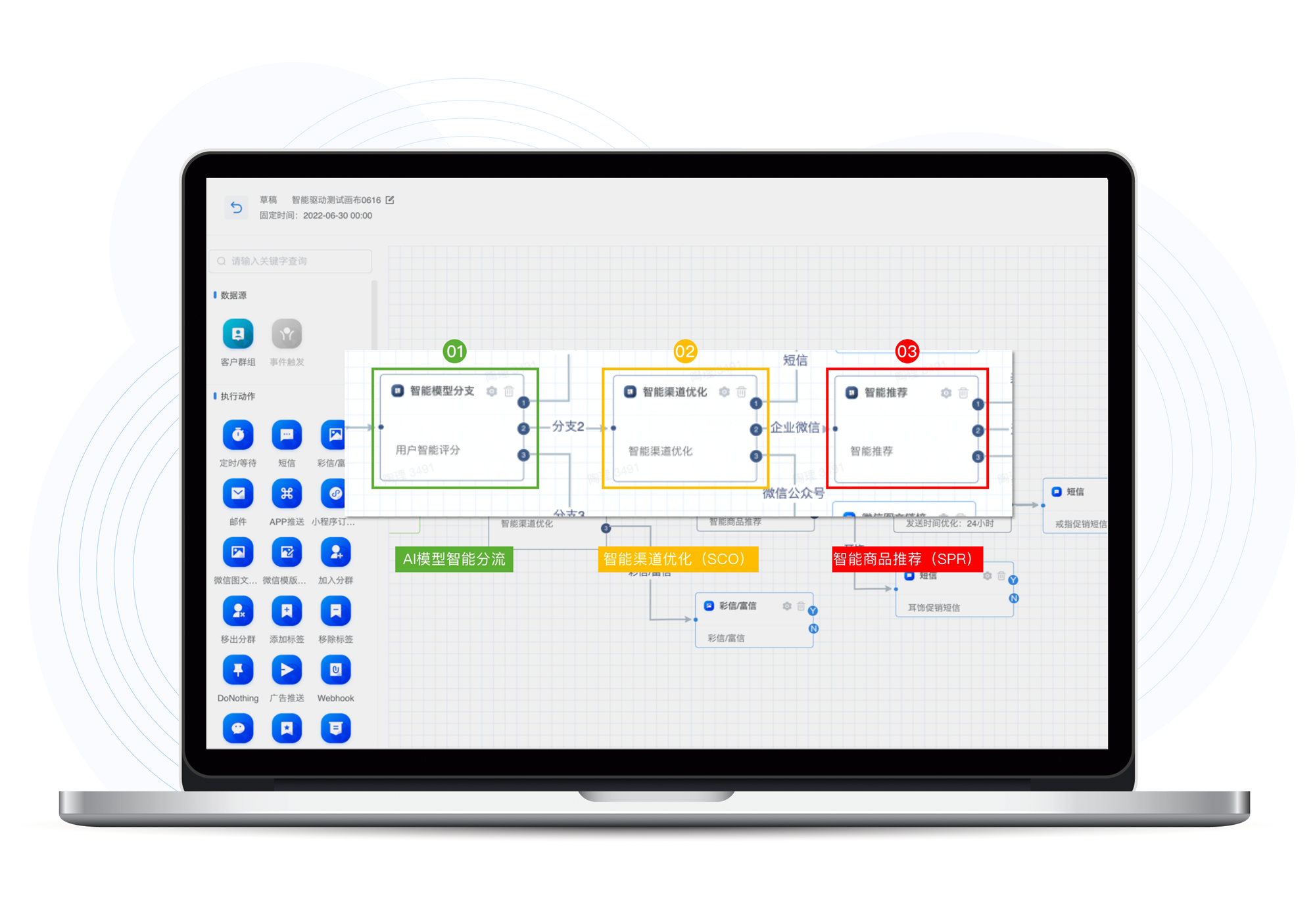 Bodog智能MA拥有智能策略编排和任务自动执行能力,可以把恰当的内容在恰当的时间通过恰当的渠道触达到恰当的人群,实现“千人千面”的数智化营销,赋能生意增长